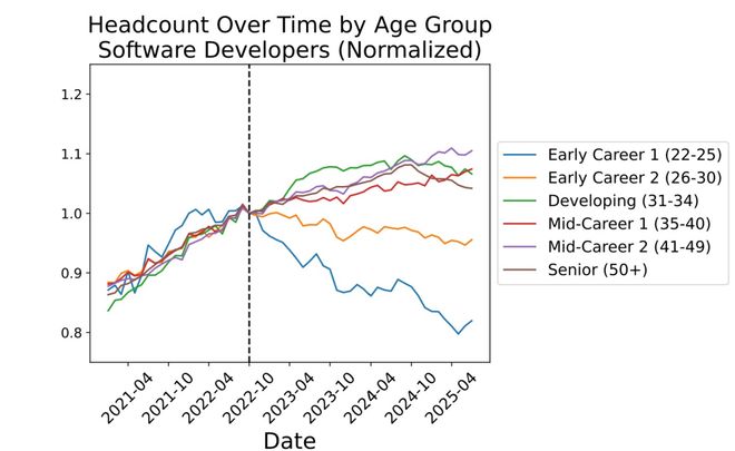 数据显示,年轻和年长开发者的就业情况直到2022年底是一致的。但从那时起,两者开始分化——年轻开发者开始失业,而年长开发者则没有。
