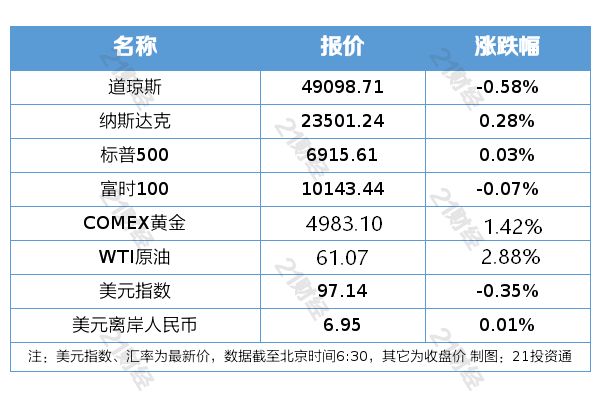 纽约股市三大股指1月23日涨跌不一。截至1月23日收盘,道琼斯工业平均指数比前一交易日下跌285.30点,收于49098.71点,跌幅为0.58%;标准普尔500种股票指数上涨2.26点,收于6915.61点,涨幅为0.03%;纳斯达克综合指数上涨65.22点,收于23501.244点,涨幅为0.28%。